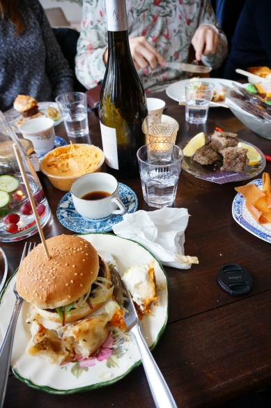 Bietenburgers zie je tegenwoordig overal! Deze bietenburger van Food for Thought deed me erg denken aan onze eigen bietenburger uit het Vegatopia kookboek. Hij was heerlijk, met o.a. rode biet, zwarte bonen en een saus met jalapeño peper. Nick en Merel zijn erg enthousiast over wat ze maken en vertellen er graag over. De knalroze ingelegde groente (rettich met rode biet?) en falafel met tahinsaus waren ook niet te versmaden.