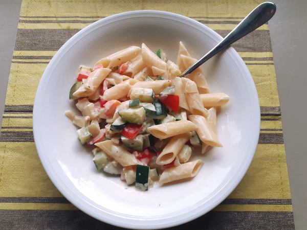 Het is weer zonnig, dus gaan we voor een eenvoudig gerecht dat zomers oogt, snelle pasta met courgette, paprika en roomkaas. Tevens een van onze meer bekeken recepten op Vegatopia.