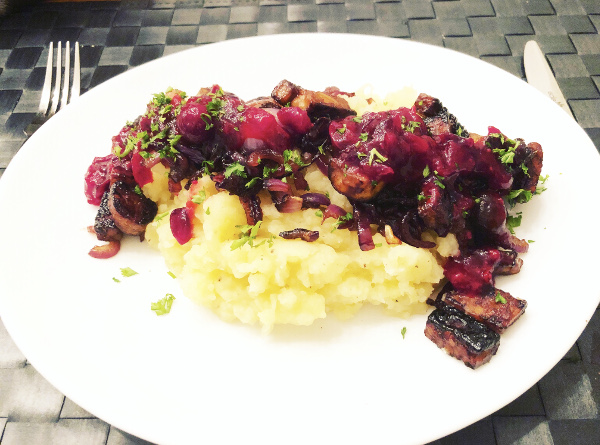 Hete bliksem kennen de meeste mensen vooral als een oud-Nederlands gerecht dat bestaat uit aardappels, goudreinetten en zoete appels. Het vocht dat tijdens het kookproces van de appels afkomt blijft nog lang gloeiend heet, vandaar de benaming ‘hete' bliksem. Wij maken Hedwigs feestelijk versie, hete bliksem met gekarameliseerde uien, tempeh en cranberrycompote.