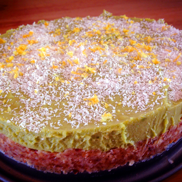 Avocadotaart met noten, dadels, kokos en ahornsiroop
