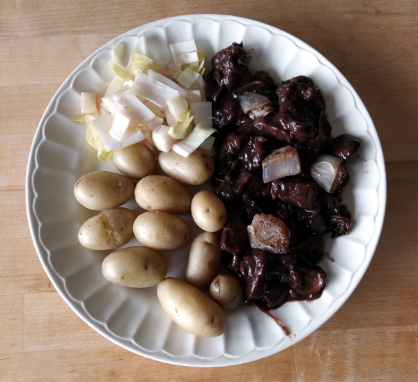 - Strooi de bloem over het geheel, meng en laat een minuut al roerend meebakken. Nu doe je de appelstroop, het bouquet garni , kruidnagel en één el azijn erbij, samen met de rest van de wijn. De tempeh moet ongeveer tot twee derde onderstaan met vocht. Voeg zo nodig nog wat wijn toe. Laat ongeveer 20 minuten stoven, de saus in de stoofpot moet ongeveer tot één derde ingedikt zijn. Maak op smaak met zout en peper. Verhit ondertussen in een koekenpan de boter en voeg de sjalotten toe. Laat ze zacht en gaar worden op een laag vuur, dit duurt ook ongeveer 20 minuten. Voeg dan de resterende eetlepel balsamico azijn toe. Leg om af te maken de sjalotten op de stoofpot en serveer.