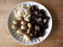 - Snijd de tempeh in blokjes van 1x2 cm. Doe in een kom met enkele eetlepels van de rode wijn, de ui, in dunne ringen gesneden en zout en peper. Laat een half uur marineren.