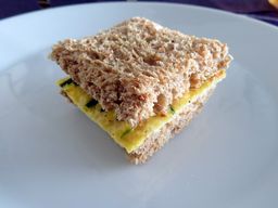 - Snij eventueel de korsten van de boterhammen. Besmeer één zijde met boter. Leg de omelet op een boterham, bestrooi met wat paprika- of kerriepoeder. Leg de andere boterham bovenop, met de beboterde zijde aan de onderkant. Snij de omelet bij, zodat deze niet uitsteekt buiten de boterhammen. Snij daarna de boterhammen in vieren. Dit kan in reepjes of driehoekjes.