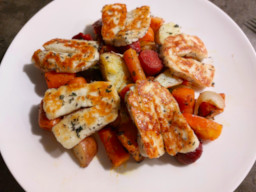 In de ijdele hoop dat ze toch nog zouden groeien, stonden de rode bieten in mijn moestuin daar al veel te lang. Groter werden ze niet, maar lekker waren ze gelukkig toch – bleek bij de late oogst. Samen met pompoen uit de tuin plus wat andere groenten, heb ik ze geroosterd in de oven. Een makkelijk en heerlijk herfstgerecht, dat door de halloumi nóg smaakvoller wordt. Dit recept is voor bereiding in de oven, maar liefhebbers kunnen de groenten ook in de airfryer bakken.