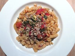 - Schep de pasta met groenten op diepe borden en strooi er de rest van de zonnebloempitten en basilicum over.