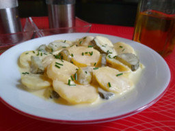Een paar dagen geleden plaatste Sven een recept voor Weense aardappelsalade, een type salade die je overal in Zuid-Duitsland en Oostenrijk vindt. De Noord-Duitse tegenhanger is wat steviger en minder verfijnd - 'deftig' noemen de Noord-Duitsers dat. En een aardappelsalade zonder mayonaise mag in Noord-Duitsland geen Kartoffelsalat heten.