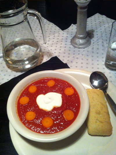 Het is wintersoepenweer. Forumbezoekster Sam maakte soep van krootjes (=bieten) en wortel, dus een beetje een zoetige soep. Er gaat ook een uitje en veel specerijen in, en het geheel wordt geserveerd met een flinke bloep zure room.