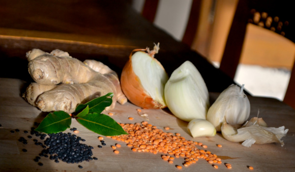 - Fruit in een ruime pan met een beetje olie de ui tot hij licht begint te kleuren. Voeg de knoflook, rode linzen en alle ingrediënten tot de zwarte linzen toe. Fruit nog 1 minuut en schenk er water op tot alles ruim onder staat.