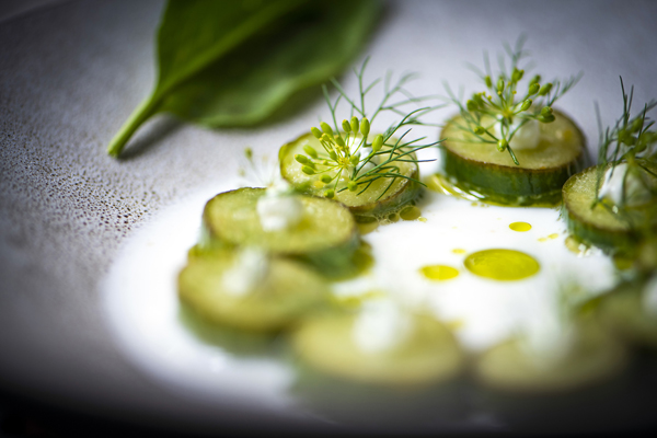 We werden onmiddellijk aangenaam verrast door de toon zettende amuses: wortel met soja en quinoa-crumble en warme ajuinsoep. Als eerste gerecht verscheen gerookte ricotta met krokante schorsenerenstukjes, waterkers en citroenmelisse. Een hartige en frisse start.
